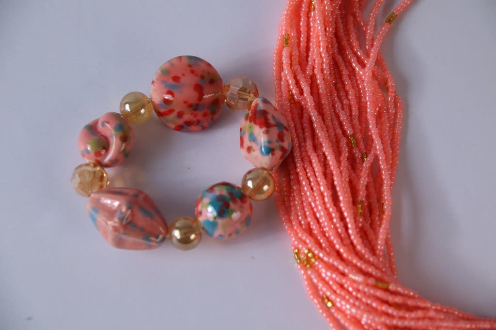 Softness meets strength in the Blush Lineage set—a celebration of feminine heritage with a contemporary spirit. This handcrafted three-piece jewellery set features a graceful multi-strand necklace composed of vibrant pink seed beads, delicately accented with gold. It pairs beautifully with a standout bracelet combining marbled pastels and golden rounds. For the modern African woman navigating diasporic duality, this set is an ode to elegance, culture, and everyday beauty.