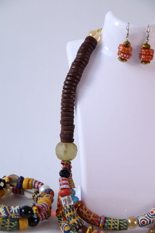 Colourroot Trail flows with heritage and joyful rhythm. This coordinated jewellery set includes a necklace, bracelet, and earrings crafted from earthy disc beads, bold red-yellow-green patterned cylinders, and shimmering gold-tone rounds. The arrangement moves like a cultural procession—designed for wearers who walk with pride, rooted in legacy and radiant in expression.