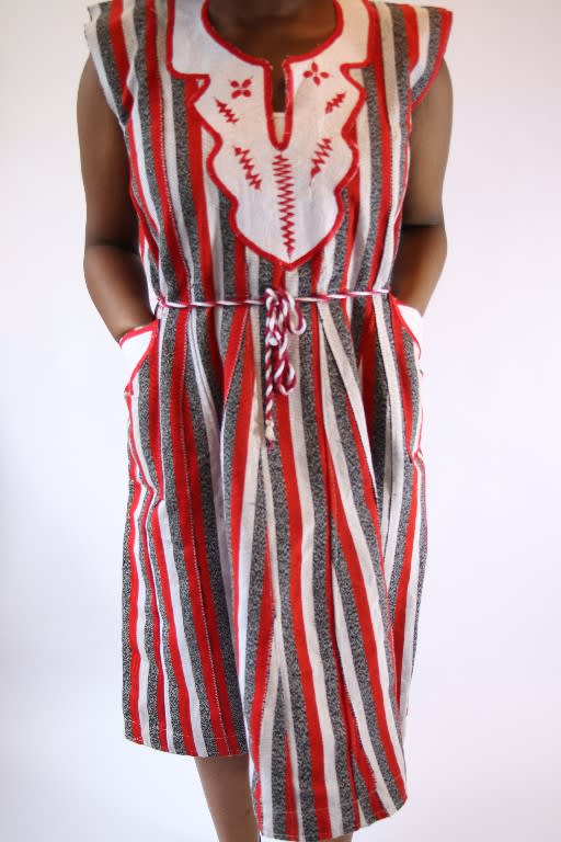 Festive Threads is all about confidence, culture, and celebration. This traditional Ghanaian smock brings together bold stripes of red, black, and white with rich red embroidery that adds a vibrant focal point to the chest. It’s handcrafted with care and fully lined for extra comfort—so it feels just as good on the inside as it looks on the outside.