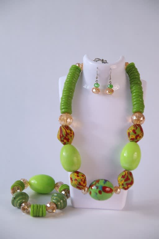 Legacy Leaf – Green, Patterned & Faceted Bead jewellery Set (Krobo)