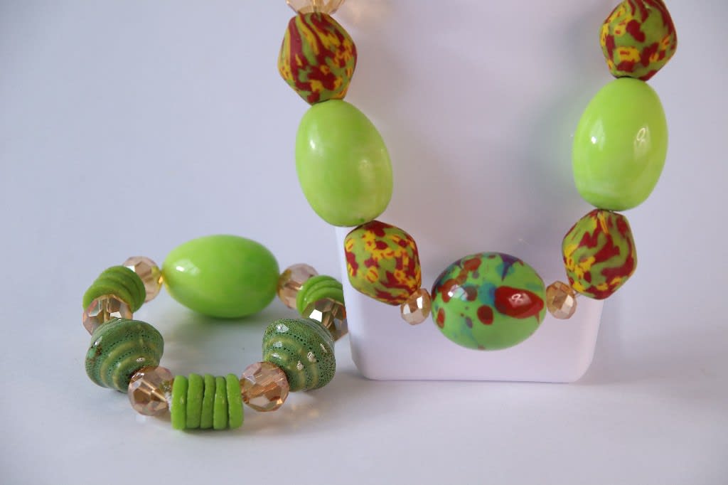 - Materials Used: Green polymer oval beads, patterned round beads (green, red, yellow), translucent faceted rounds, silver-tone earring hooks, metal coil bracelet base
