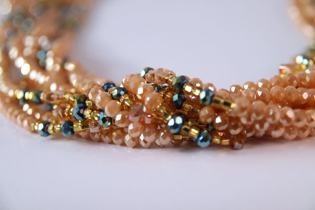 - Materials Used: Peach-toned polymer beads, iridescent glass accents, woven nylon thread, loop fastening