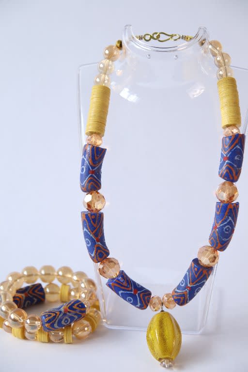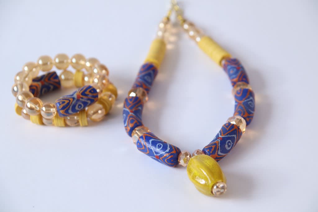 Sunbeat Mosaic – Blue & Amber Patterned Bead Jewellery Set (naani)