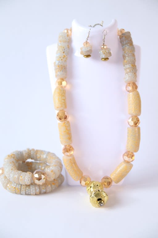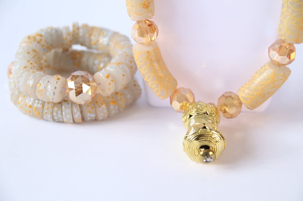 Sunthread Bloom glows with rhythm and cultural brilliance. This coordinated three-piece set includes a necklace, bracelet, and earrings crafted from golden faceted beads and cylindrical yellow patterned forms. The arrangement flows like sunlight through woven heritage—designed for wearers who bloom in their truth and shine with ancestral pride.
